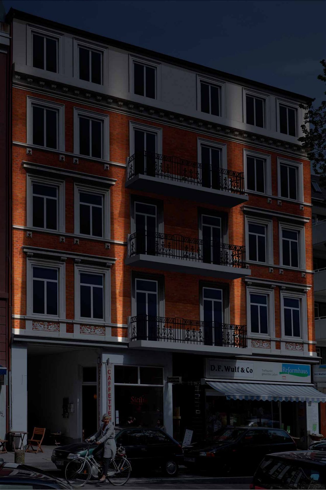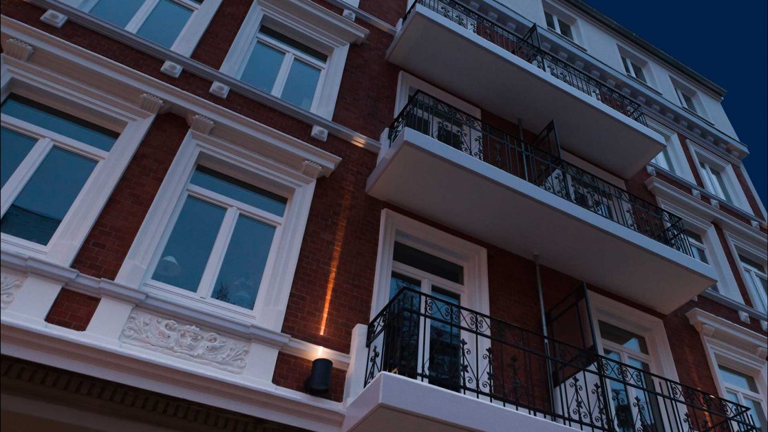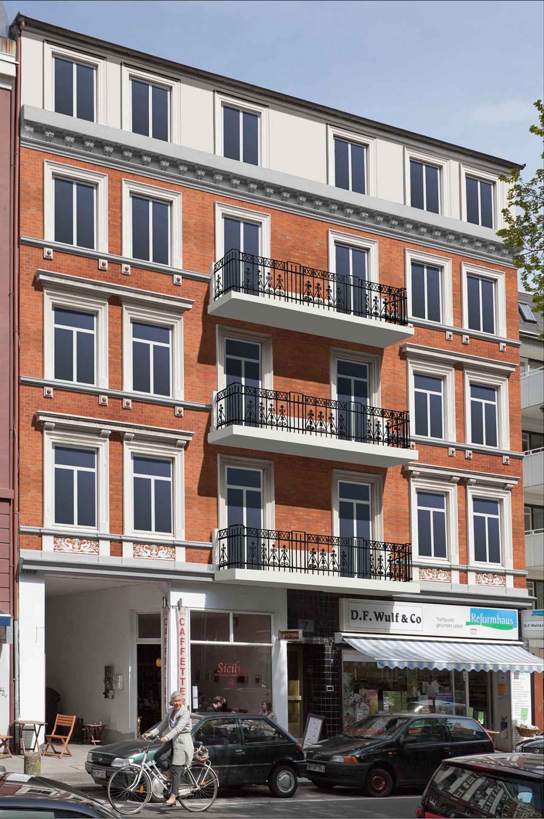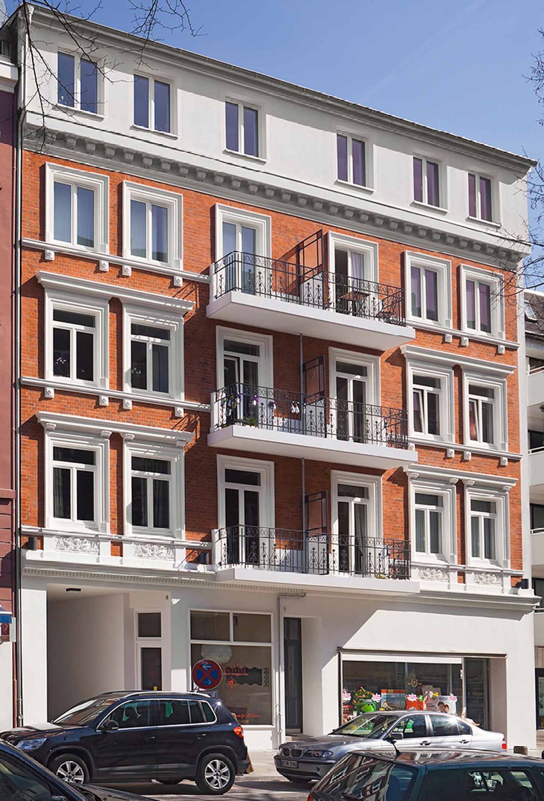 Die Gliederung der Fenster, der wilhelminische Verblendstein sowie die weißen Schmuckelemente sollen wieder dem Originalzustand aus dem Jahr 1890 angeglichen werden.